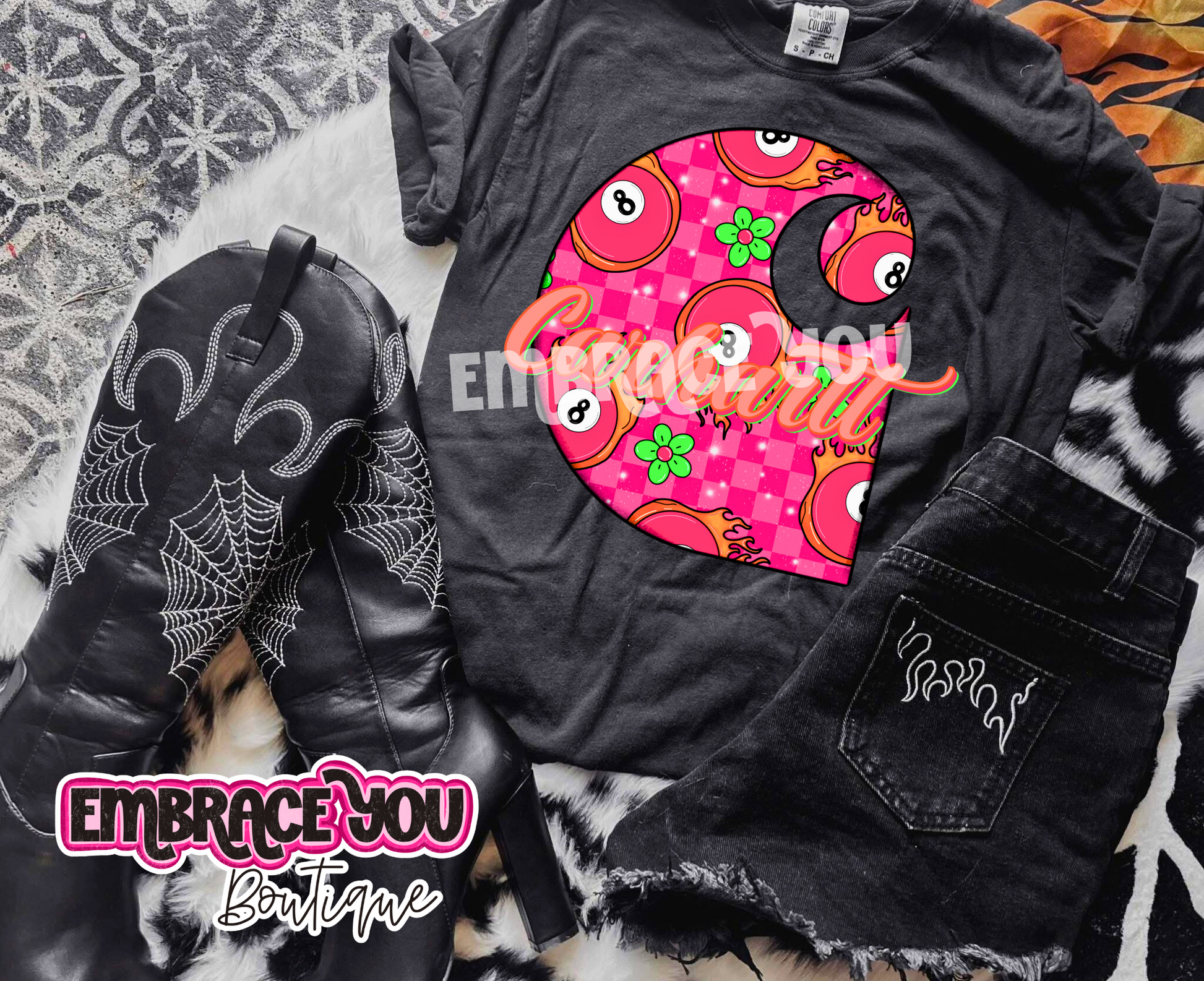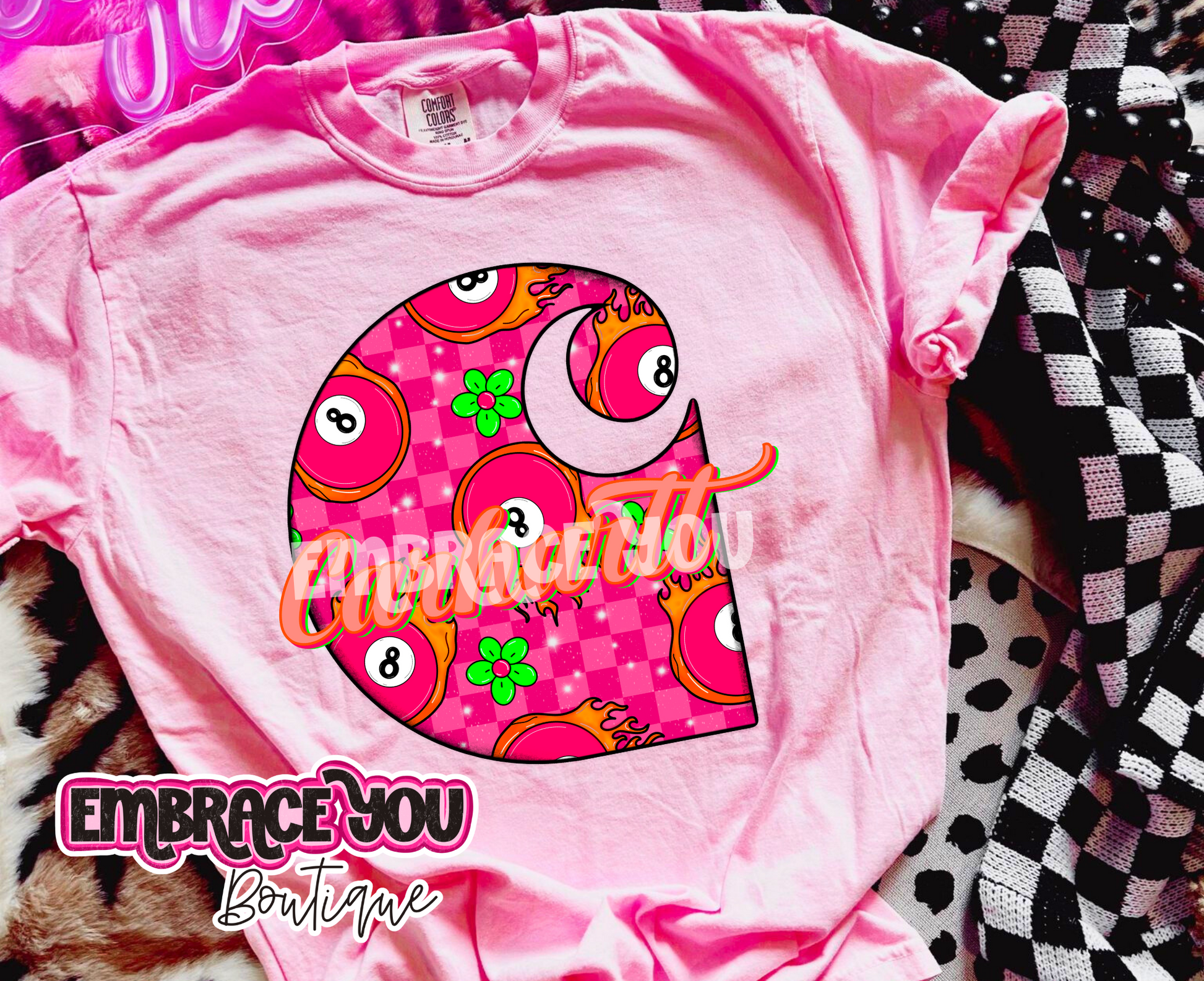 This playful graphic tee combines edgy western vibes with a classic checkered pattern and an iconic eight ball design. Crafted with Carhartt-inspired durability, it’s perfect for adding a bold statement to your casual wardrobe. Expect a 1-2 week turnaround time to get this standout piece ready for your next adventure.