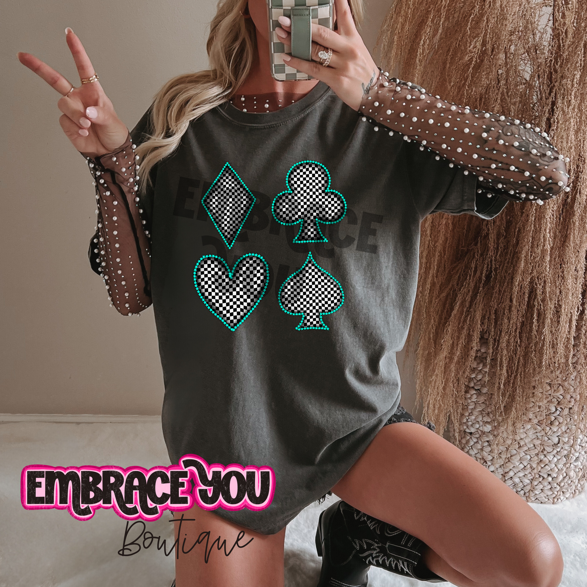 Show off your playful side with this Checkered Playing Card Graphic Tee. Featuring a bold western-inspired checkered design and vibrant playing card graphics, this Comfort Colors brand tee offers both style and softness. Perfect for casual days or game nights, it combines eye-catching flair with all-day comfort. Please allow 1-2 weeks for delivery.