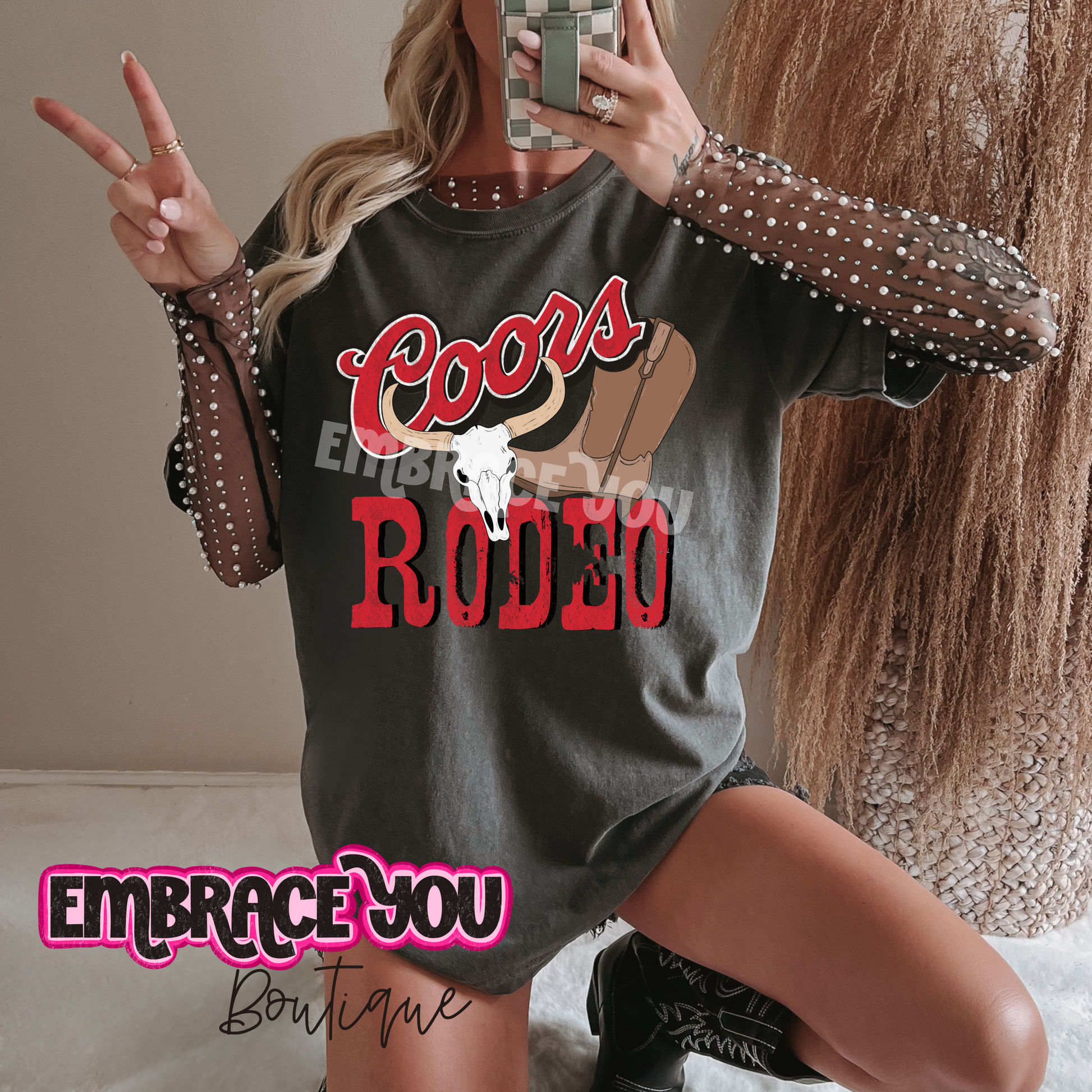 Ride into style with the Coors Rodeo Graphic Tee! This comfortable graphic tee features a classic coors rodeo design with boots and a bull skull. Made with comfort colors and a quick turnaround time of 1-2 weeks. Giddy up and grab one now!
