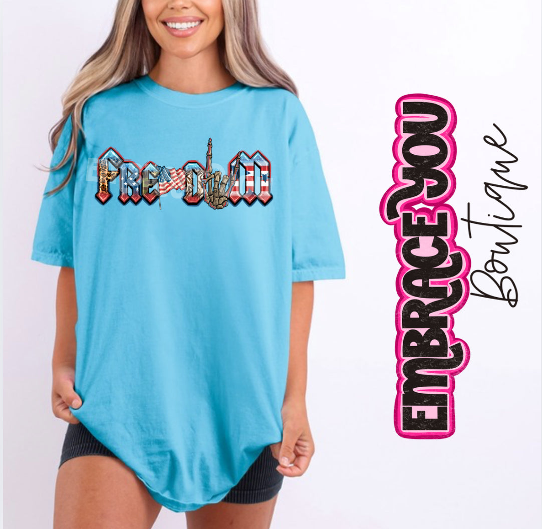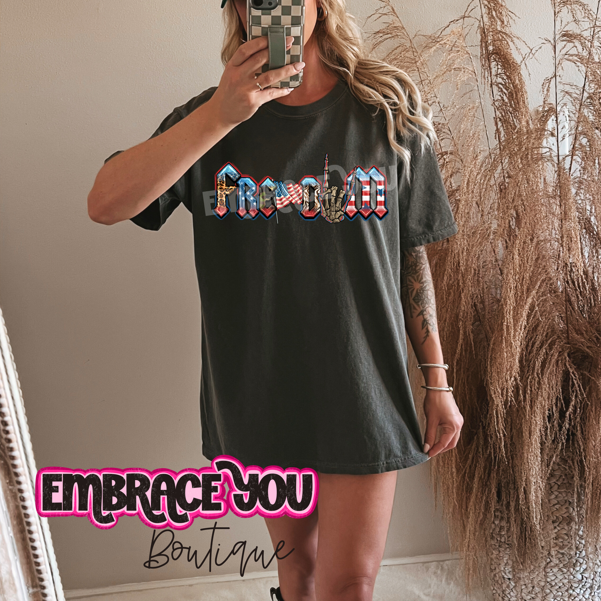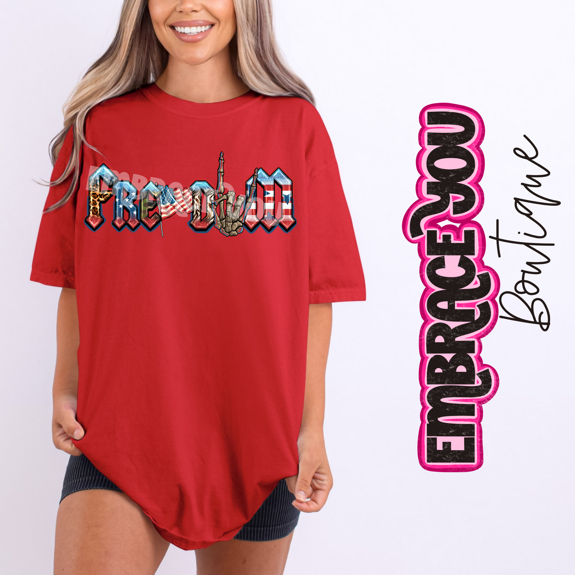 Experience ultimate freedom in this edgy graphic tee. Made with comfort colors, this patriotic shirt is perfect for any casual outing. With a 1-2 week turnaround time, you'll be rocking this tee in no time! (Just in time for Independence Day)