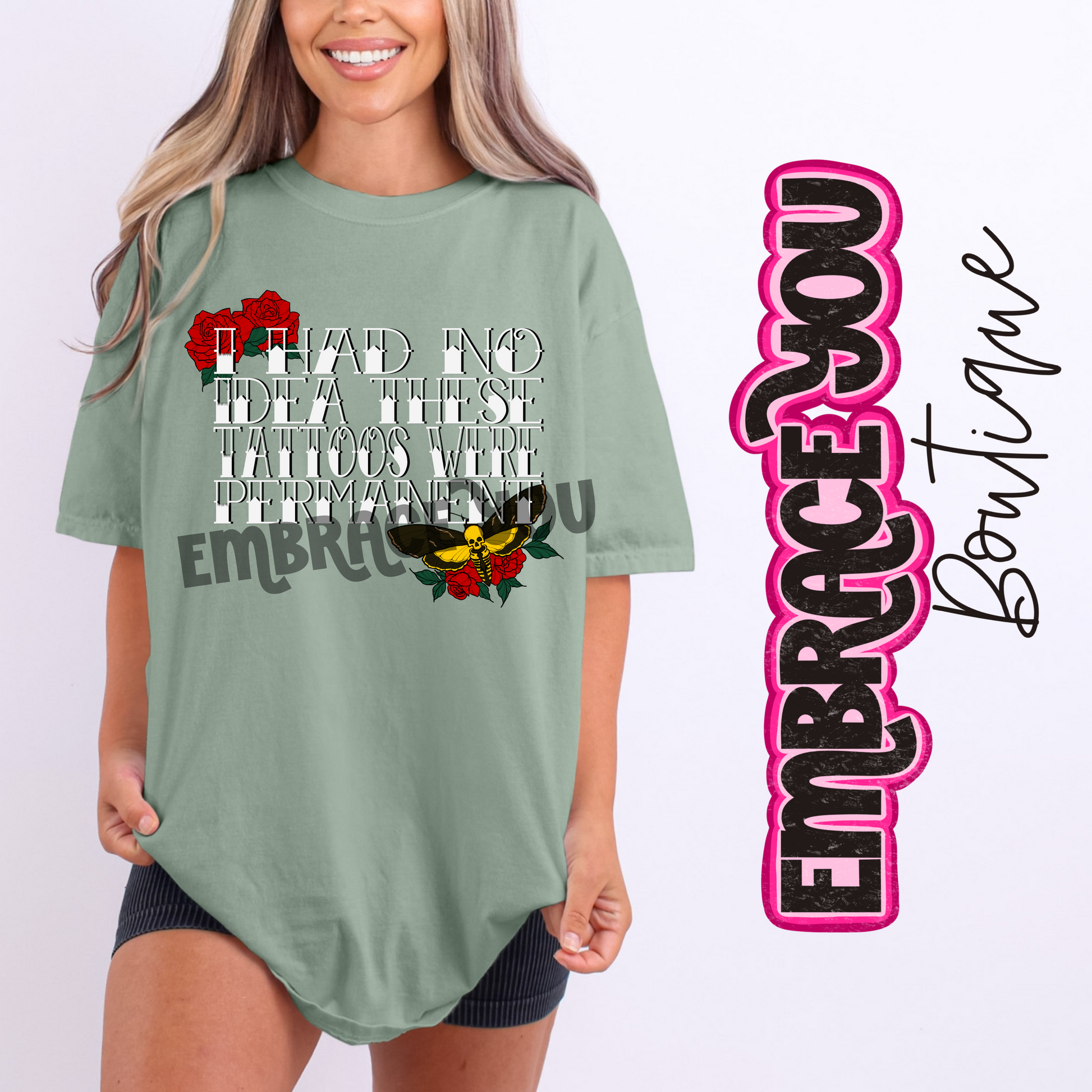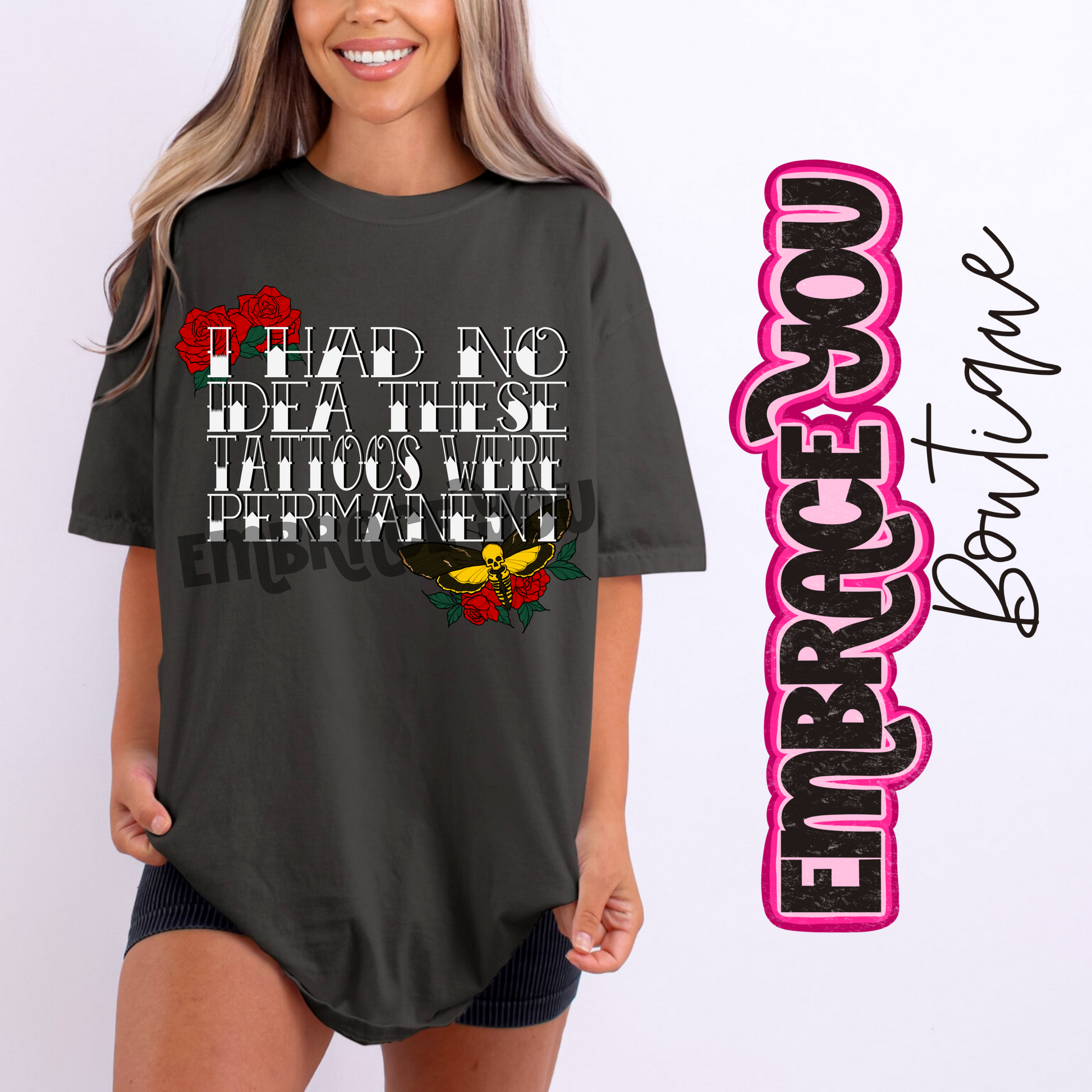 Show off your witty side with this playful graphic tee featuring the cheeky phrase, "I Had No Idea These Tattoos Were Permanent." Printed on Comfort Colors , it offers all-day comfort with a relaxed fit. Perfect for those who love a bit of sarcasm and style, this tee is a fun way to express your personality. Expect your new favorite shirt delivered within 1-2 weeks.