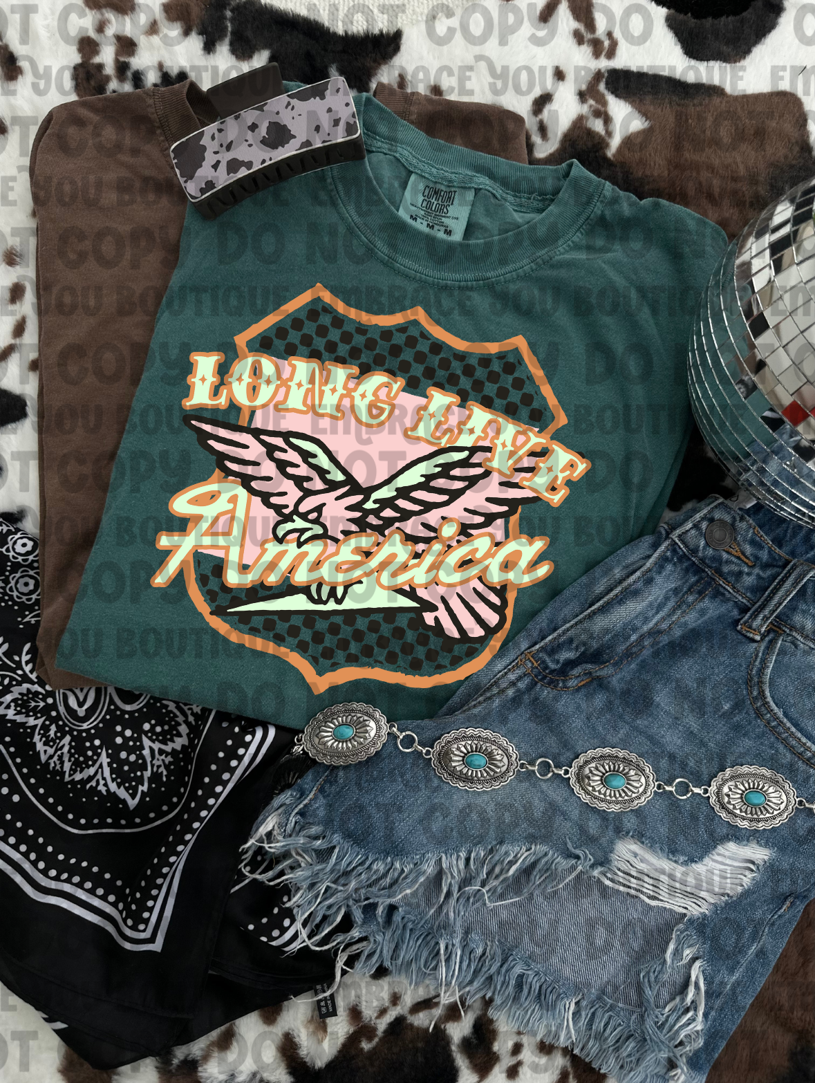 Stay comfortable while showing off your patriotism with our Long Live America Graphic Tee. Perfect to wear YEAR ROUND. Each one is made to order with a 1-2 week turnaround time. So go ahead and show your pride in a fun and unique way!