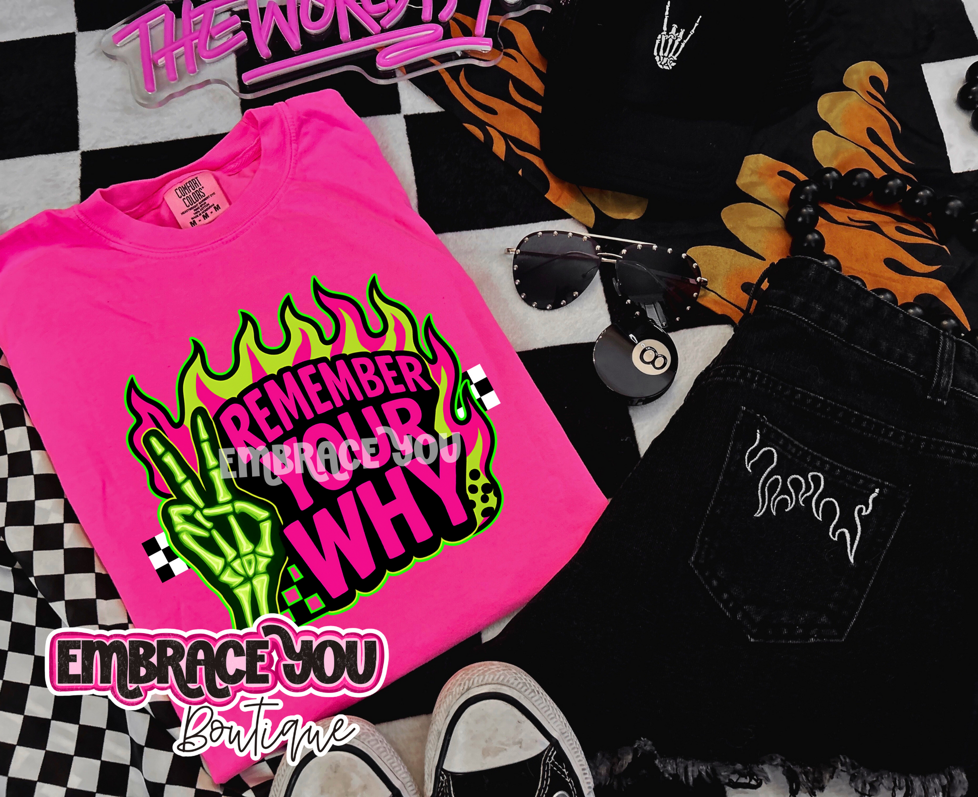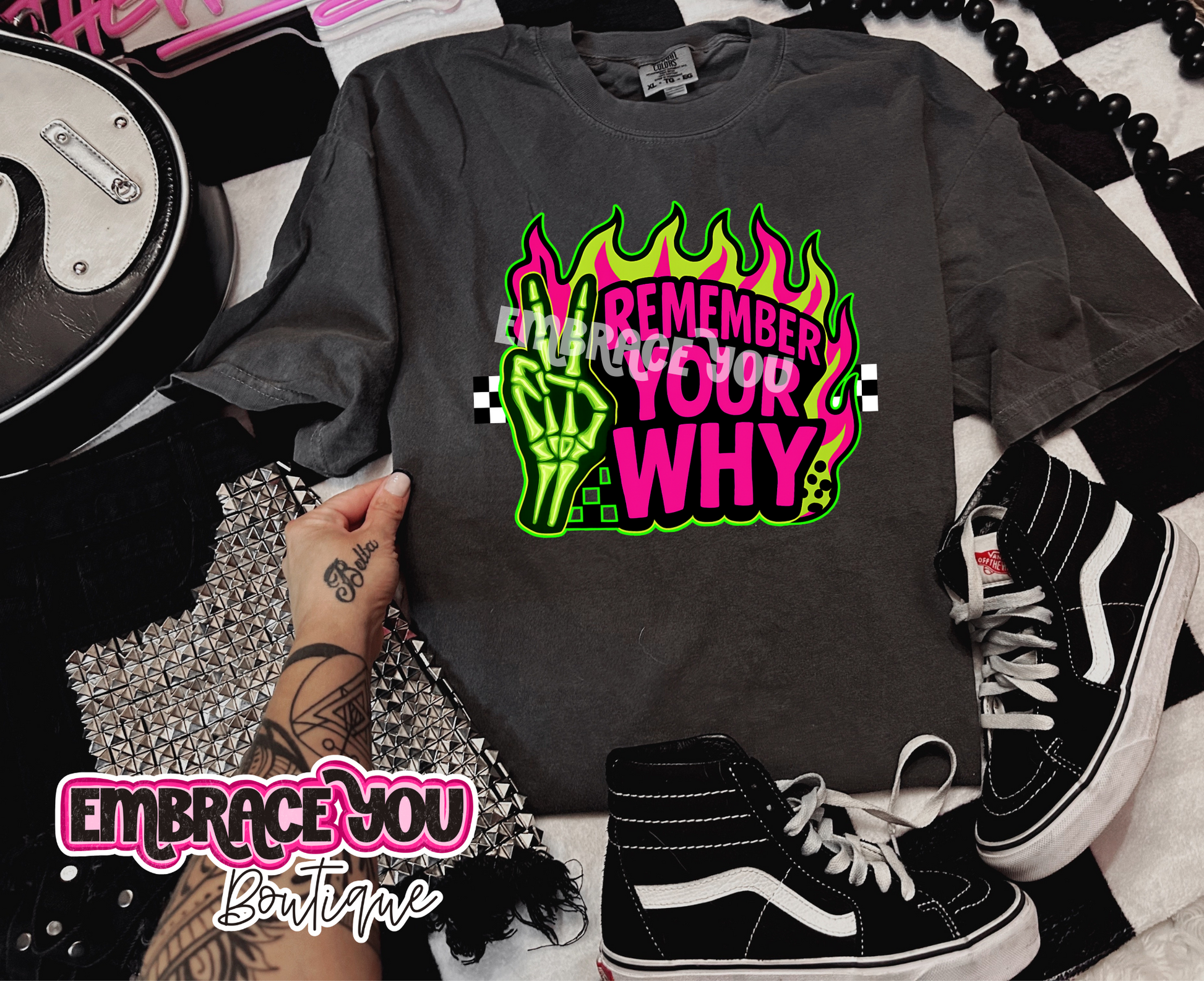 Fuel your fire with the Remember Your Why Graphic Tee. This edgy, bold design keeps your motivation front and center, reminding you to stay true to your purpose every day. Crafted for comfort and style, it’s perfect for those who dare to be different. Plus, with a quick 1-2 week turnaround, you’ll be rocking your new favorite tee in no time. Wear your why loud and proud!